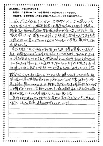 施工にあたっては、現地をよく見ていただき、図面の提示から始まり、材料を見せていただいたり、レイアウトに至っても適切なアドバイスやアイディアをいただきました。追加工事にも快く応じていただき、ついついあれもこれもと甘えてしまいました。職人さんたちも本当に良い人ばかりで人柄・仕事ぶりに表れていました。解体の若い方たちは笑顔で楽しそうに仕事をされているのが印象的でした。