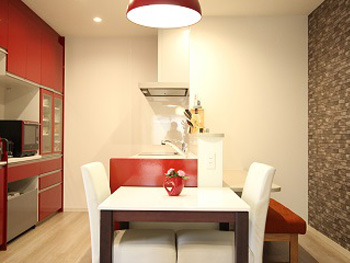 既存のキッチンを活用。赤が映えるLDKになりました。